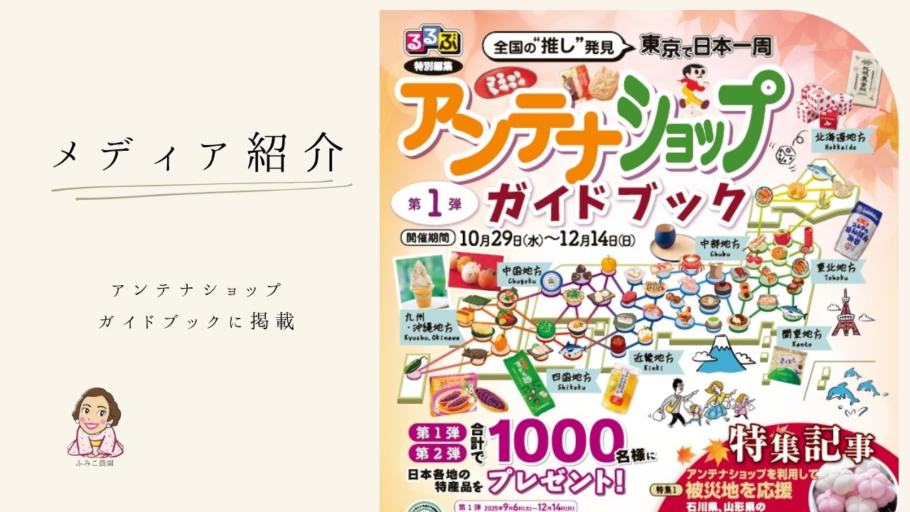 るるぶ(特別編集)東京で日本一周!アンテナショップガイドブックに掲載されました! 投稿: 2025年11月3日 東京にある「わかやま紀州館」がアンテナショップガイドに掲載されまして、その中でふみこ農園の【わかやま […]
